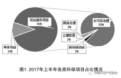 2017年上半年(截至2017年6月30日的數(shù)據(jù),下同),環(huán)境綜合治理項(xiàng)目出現(xiàn)爆發(fā)式增長(zhǎng),樣本上市公 司披露各類中標(biāo)、簽約項(xiàng)目92項(xiàng),占上半年披露項(xiàng)目總數(shù)的51%,投資總額約1470億元,占上半年披露項(xiàng)目投資總額的89.5%,成為推動(dòng)環(huán)保市場(chǎng)增長(zhǎng)的主要因素。其中,受“河長(zhǎng)制度”( 2016年12月,中中央辦公廳、國(guó)務(wù)院辦公廳印發(fā)《關(guān)于全面推行河長(zhǎng)制的意見(jiàn)》,要求2018年底前全面建立河長(zhǎng)制,實(shí)現(xiàn)省、市、縣、鄉(xiāng)四級(jí)主要領(lǐng)導(dǎo)對(duì)水環(huán)境質(zhì)量直接負(fù)責(zé))和PPP(政府與社會(huì) 資本合作模式)政策的雙重推動(dòng),水環(huán)境綜合治理項(xiàng)目增長(zhǎng)最多,項(xiàng)目總投資約1365億元;固廢綜合治理項(xiàng)目總投資約43億元;土壤污染綜合治理項(xiàng)目26億元。2017年上半年各類環(huán)保項(xiàng)目占比情況如圖1。