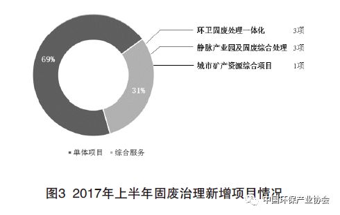 從2017年上半年環(huán)保上市公司披露的項(xiàng)目來(lái)看,42個(gè)固廢處理項(xiàng)目中,35個(gè)單體項(xiàng)目,投資總額97億元;7個(gè)綜合項(xiàng)目投資總額43億元。其中,環(huán)衛(wèi)固廢處理一體化項(xiàng)目3個(gè),固廢綜合處理及靜脈產(chǎn)業(yè)園建設(shè)3個(gè)。以中國(guó)天楹中標(biāo)的寧夏固原市循環(huán)經(jīng)濟(jì)產(chǎn)業(yè)園及環(huán)衛(wèi)一 體化項(xiàng)目為例,該項(xiàng)目披露總投資15億元,包含生活垃圾焚燒發(fā)電BOT項(xiàng)目(30年)、餐廚垃圾處置BOT項(xiàng)目(30年)、污泥干化BOT項(xiàng)目(30年)、建筑垃圾循環(huán)利用項(xiàng)目(30年)以及城鄉(xiāng)環(huán)衛(wèi)一體化項(xiàng)目(30年)。 2017年上半年固廢治理新增項(xiàng)目情況如圖3。