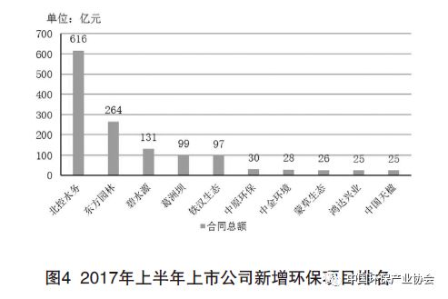 在政策和資本推動(dòng)下,環(huán)保產(chǎn)業(yè)迅猛發(fā)展,環(huán)保企業(yè)規(guī)模逐漸壯大,拿單能力不斷提升。根據(jù)咨詢公司從公開(kāi)渠道的資料統(tǒng)計(jì),上半年上市公司披露的環(huán)保項(xiàng)目中,北控水務(wù)簽約中標(biāo)環(huán)保項(xiàng)目15個(gè),投資總額616億元(聯(lián)合體項(xiàng)目由于內(nèi)部投資額分配情況不明,因此按牽頭人統(tǒng)計(jì),例如去年中標(biāo)今年簽約的4個(gè)北京市通州區(qū)水環(huán)境治理項(xiàng)目總投資280億元,北控水務(wù)為牽頭人,則全部計(jì)入北控水務(wù)投資),其次,東方園林、碧水源等公司也獲得超過(guò)百億元的新增項(xiàng)目,拿單能力分化趨勢(shì)凸顯。2017年上半年上市公司新增環(huán)保項(xiàng)目排名見(jiàn)圖4。