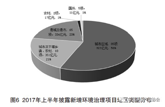 PPP模式做為我國(guó)新型城鎮(zhèn)化建設(shè)的重要工具,一方面為社會(huì)資本參與城鎮(zhèn)環(huán)境治理提供了渠道,另一方面解決了中小城鎮(zhèn)政府財(cái)政支付能力不足的問(wèn)題,成為目前中小城鎮(zhèn)實(shí)施環(huán)境治理項(xiàng)目的主要模式。2017年上半年65個(gè)中小城鎮(zhèn)環(huán)保項(xiàng)目中,36個(gè)為PPP模式項(xiàng)目,總投資285億元,投資額占比達(dá)80%。除流域治理等綜合服務(wù)項(xiàng)目外,許多污水處理廠、垃圾焚燒發(fā)電項(xiàng)目等單體項(xiàng)目也普遍采用了PPP模式(見(jiàn)圖6)。
