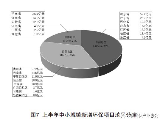 從地域分布來(lái)看,貴州、山東、河南、廣東等省市中小城鎮(zhèn)環(huán)保項(xiàng)目總投資額較大。總體來(lái)看,東部地區(qū) 中小城鎮(zhèn)環(huán)保市場(chǎng)活躍,投資額占比超過(guò)44.1%,中部地區(qū)占比21.2%,西部地區(qū)占比34.8%。2017年上半年中小城鎮(zhèn)新增環(huán)保項(xiàng)目地區(qū)分布見(jiàn)圖7。