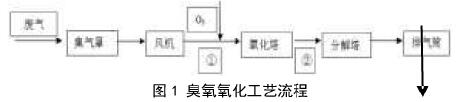 試驗裝置工藝流程如圖1所示。廢氣在①管路與O3混合后進入氧化塔與O3發(fā)生氧化反應(yīng)后,再經(jīng)②管路進入臭氧分解塔,分解剩余O3后完成對廢氣的凈化,達(dá)到排放標(biāo)準(zhǔn),經(jīng)排氣管排放。具體流程見工藝流程圖1。