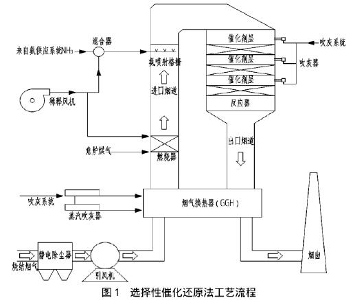 燒結(jié)煙氣經(jīng)電除塵后,通過(guò)引風(fēng)機(jī)加壓進(jìn)入SCR反應(yīng)系統(tǒng),燒結(jié)煙氣進(jìn)入脫硝反應(yīng)器之前,經(jīng)過(guò)煙氣換熱器(GGH)初步預(yù)熱,充分利用反應(yīng)器出口煙氣的高溫對(duì)低溫?zé)Y(jié)煙氣進(jìn)行傳熱升溫。GGH設(shè)置蒸汽吹灰器和循環(huán)水沖洗裝置,以保證空氣預(yù)熱器正常穩(wěn)定運(yùn)行。初步預(yù)熱后的燒結(jié)煙氣進(jìn)入煙道燃燒器進(jìn)一步升溫至催化劑最佳活性溫度(320℃~450℃)。燃燒器內(nèi)的燃料一般選用熱值較高的焦?fàn)t煤氣。加熱后的燒結(jié)煙氣流經(jīng)氨噴射格柵,在氨噴射格柵內(nèi),經(jīng)氨氣/空氣混合器按一定比例混合后的氨氣噴入燒結(jié)煙氣中,隨燒結(jié)煙氣進(jìn)入頂部煙道,頂部煙道設(shè)有導(dǎo)流分配裝置,使煙氣均勻平穩(wěn)地通過(guò)反應(yīng)器催化劑層。在催化劑的作用下,NH3與煙氣中的NOx進(jìn)行反應(yīng),轉(zhuǎn)換成N2和H2O,最終達(dá)到脫硝的目的。