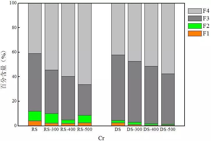 對(duì)比兩種熱解炭中Cr的分布可以發(fā)現(xiàn),消化污泥熱解炭中穩(wěn)定態(tài)Cr含量均高于同等溫度下生污泥熱解炭,尤其是F3態(tài)Cr的含量。以300 ℃熱解炭為例,RS-300和DS-300中F3態(tài)Cr的含量分別為35.4%和49.7%。這可能是因?yàn)樯勰嘀泻写罅康暮蚧衔?S含量達(dá)到1.97%),在厭氧環(huán)境下Cd更易形成硫化物,使消化污泥中F3態(tài)含量高于生污泥,從35.5%增加到53.5%,進(jìn)而導(dǎo)致消化污泥熱解炭中F3態(tài)Cr含量高于生污泥熱解炭。