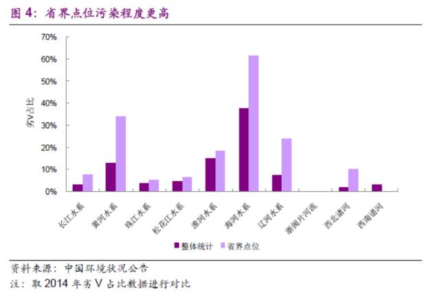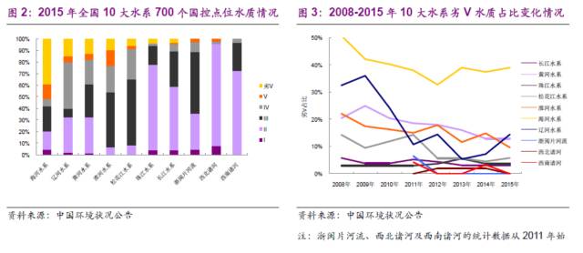 我國河流污染情況依舊嚴(yán)重,整體雖有所好轉(zhuǎn),但2011-2015年期間改善不明顯。根據(jù)2015年中國環(huán)境狀況公告顯示,長江、黃河、珠江、松花江、淮河、海河、遼河等七大流域和浙閩片河流、西北諸河、西南諸河的700個國控點位中;IV類占14.3%,V類占4.7%,劣V類占8.9%且主要集中在海河、淮河、遼河和黃河流域。海河監(jiān)控點位水質(zhì)劣V類達(dá)到39.1%,其中支流劣V占比更是高達(dá)44.0%。
