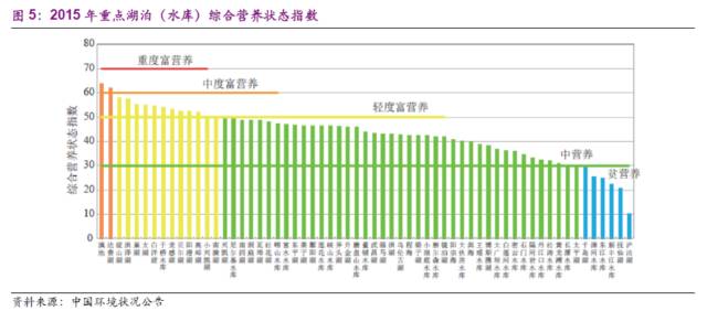 湖泊是重要的地表水資源,與人類的生活息息相關(guān),富營養(yǎng)化不可忽視。2015年,開展?fàn)I養(yǎng)狀態(tài)監(jiān)測的61個湖泊(水庫)中,貧營養(yǎng)的6個;中營養(yǎng)的41個,輕度富營養(yǎng)的12個,中度富營養(yǎng)的2個。