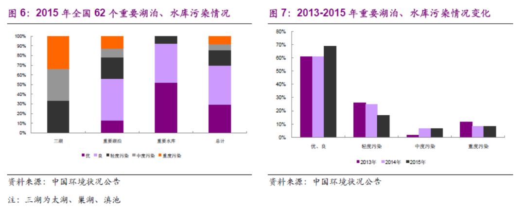 根據(jù)2015年中國環(huán)境狀況公告,“三湖”即太湖、巢湖、滇池均有不同程度的污染。重要湖泊(32個),污染比例逾30%,重點水庫水質(zhì)情況較好。而根據(jù)2013-2015年數(shù)據(jù)比較,污染情況改善依然不明顯。(注:優(yōu)為Ⅰ類和Ⅱ類水質(zhì),良好為Ⅲ類水質(zhì),輕度污染為Ⅳ類水質(zhì),中度污染為Ⅴ類水質(zhì),重度污染為劣Ⅴ類水質(zhì)。)