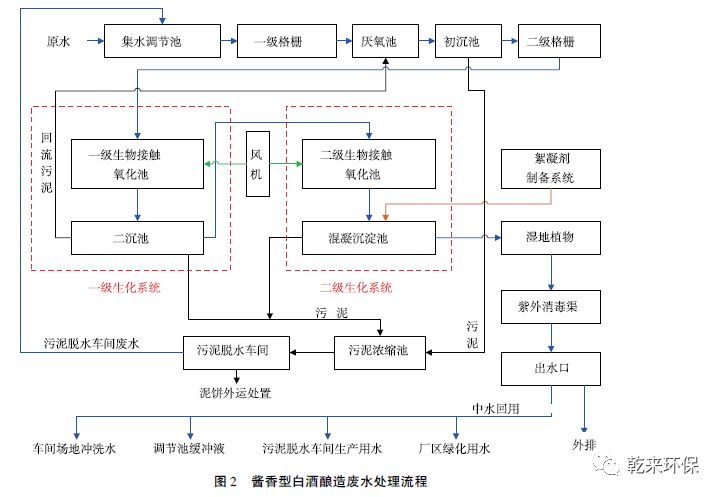 經(jīng)過比選各類工藝,根據(jù)醬香型白酒釀造的獨特工藝以及釀造過程中廢水排放的特點和性質,選取“物理化學垣兩級生化處理系統(tǒng)”工藝對醬香型白酒釀酒廢水進行處理,處理水最終經(jīng)濕地植物凈化后排入外環(huán)境,部分回用于釀造車間場地沖洗水、廢水處理污泥脫水車間沖洗水、集水井緩沖液以及廠區(qū)綠化用水,水質能夠滿足GB 27631—2011《發(fā)酵酒精和白酒工業(yè)水污染物排放標準》中表3 規(guī)定的排放標準。