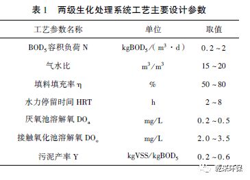 2. 3 兩級生化系統(tǒng):一級生化系統(tǒng)承擔較重的處理任務,該單元將使廢水中有機污染物削減大約70,該單元生物接觸氧化池內微生物處于對數(shù)增長期及減速增長期前段,生物膜狀態(tài)極佳,對有機物的降解速率較高;二級生化系統(tǒng)生物接觸氧化池內微生物處于微生物減速增長期后段或生物膜穩(wěn)定期,生物相較穩(wěn)定,處理水質在這一單元得到進一步的提高。每級生化系統(tǒng)均有一個厭氧池、一個生物接觸氧化池及一個沉淀池組合而成。廢水進入?yún)捬醭睾?,復雜有機污染物經(jīng)厭氧菌及兼性厭氧菌作用氨化,轉化為簡單的化合物及氨態(tài)氮。同時,聚磷菌完成釋磷過程,將細胞內聚磷水解為正磷酸鹽,并降解水中部分有機物;生物接觸氧化池通過附著在池內填料上的微生物的吸附劑分解作用,將廢水中污染物去除,釋磷菌在好氧條件下進行聚磷反應,從污水中攝取磷酸鹽,菌膠團與脫落的生物膜以及截留的懸浮物質一起,隨水流進入沉淀池,污染物通過剩余污泥的排放得以去除。此外,在生物接觸氧化池中可加入少量FeS粉末,起調節(jié)電位、絮凝及除磷的作用。工藝主要設計參數(shù)如表1 所示。