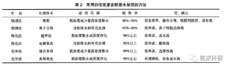 5.1物化預(yù)處理:根據(jù)工程經(jīng)驗,經(jīng)過生化法處理的廢水含酚量應(yīng)該低于300 mg/l。且水中不得含有氨、焦油或油類物質(zhì),否則就會抑制微生物的生長,影響對污染物的分解,甚至造成微生物的中毒死亡,降低廢水的處理效果。廢水中的酚類和油類物質(zhì)同屬有機物,具有“相似相容”的性質(zhì),而酚還屬于Lewis酸,易與極性水分子之間形成氫鍵,增加其在水中的溶解度,進而促進油水的惡性乳化。因此,對酚類和油類物質(zhì)的去除過程存在嚴重的相互干擾,需要通過分步交替處理以便使廢水中的污染物達到可生化處理要求。(1)脫酚工業(yè)生產(chǎn)中,酚濃度為1 000 mg/l以上的廢水稱為高濃度含酚廢水,回收利用其中的酚類物質(zhì)可增加廢水處理的經(jīng)濟效益。目前,工業(yè)上常用來處理高濃度含酚廢水的方法主要集中在物理分離方法,如:蒸汽吹脫除酚、溶劑萃取脫酚等。結(jié)合本文煤焦油加氫主體裝置的操作特點,在處理煤焦油加氫廢水時可優(yōu)先采用溶劑萃取方法脫酚,且為降低萃取劑的分離成本,所選用的溶劑應(yīng)盡量從煤焦油分餾系統(tǒng)或煤焦油加氫系統(tǒng)的中間產(chǎn)物或產(chǎn)品中選取。經(jīng)模擬計算,本文中煤焦油加氫裝置廢水中的酚可由20 000降低到1 500mg/1以下。在工程實踐中,可用于進行低濃度含酚廢水處理的方法較多(見表2),需結(jié)合主體裝置的操作特點,選擇操作方便、投資成本和運行費用低的脫酚技術(shù)。
