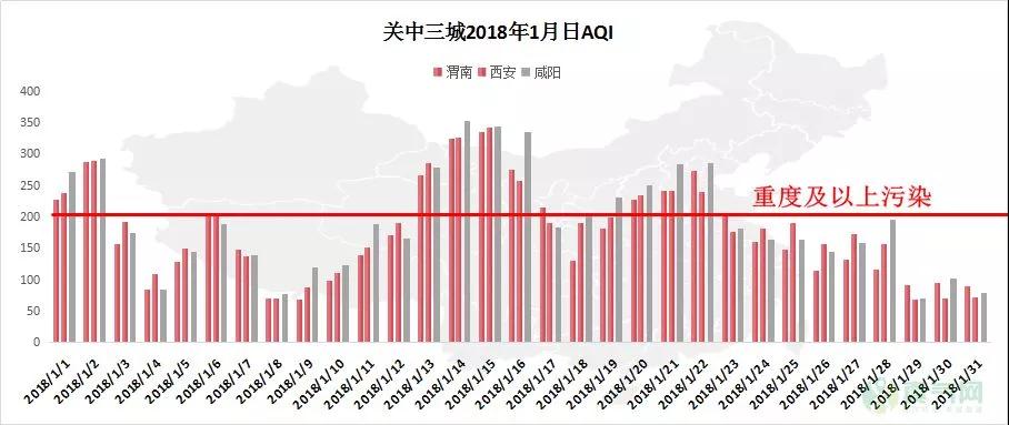 2018年1月份,關(guān)中地區(qū)西安、咸陽、渭南三城分別經(jīng)歷10、11和12天的重污染天,占三分之一之多。
