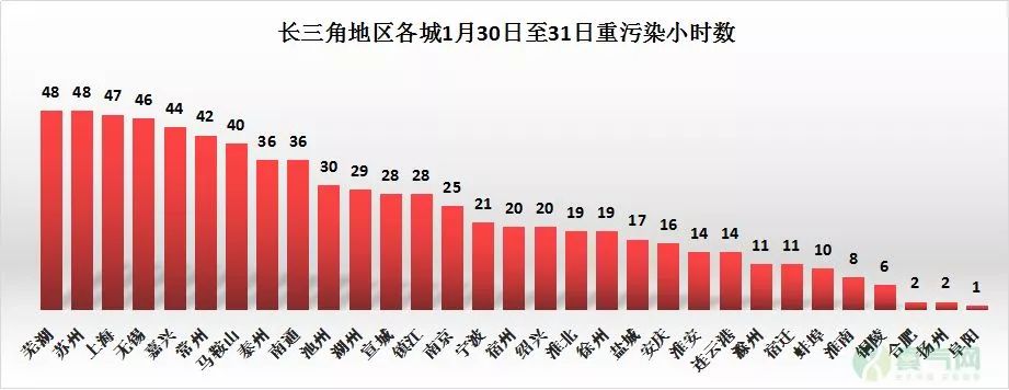 1月30日至31日,長(zhǎng)三角地區(qū)各城市中,蕪湖、蘇州、上海重度及以上污染小時(shí)數(shù)已經(jīng)高達(dá)7至48小時(shí),幾乎到達(dá)極限。據(jù)了解,此次空氣污染主要由上一波冷空氣帶來,從30日凌晨至今一直停留在長(zhǎng)三角中部地區(qū),由于長(zhǎng)三角中北部目前沒有有利的擴(kuò)散條件,風(fēng)很小,也造成長(zhǎng)三角地區(qū)連續(xù)兩天空氣污染都處于較高水平。