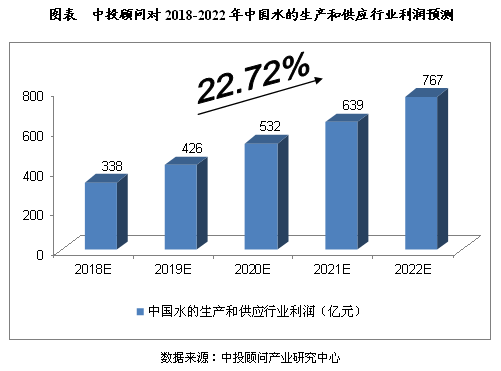 2016年1-12月,水的生產(chǎn)和供應(yīng)業(yè)利潤總額達(dá)到199.900億元,同比增長14.36%;2017年1-9月,水的生產(chǎn)和供應(yīng)業(yè)利潤總額達(dá)到194.200億元,同比增長54.74%。我們預(yù)計(jì),2018年我國水的生產(chǎn)和供應(yīng)行業(yè)利潤將達(dá)到338億元,未來五年(2018-2022)年均復(fù)合增長率約為22.72%,2022年將達(dá)到767億元。