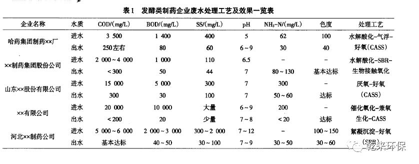 目前,國(guó)內(nèi)外對(duì)抗生素廢水處理的工藝已經(jīng)基本定型,主要分為物化處理和生化處理。物化處理的主要作用是降解難分解的大分子有機(jī)物,能夠讓廢水在進(jìn)人生物處理工段后能夠更高效率地被微生物吸收利用,其次是失活分解廢水中的殘余抗生素,可以有效地避免對(duì)后期的生物處理產(chǎn)生不利影響;生化系統(tǒng)是抗生素廢水處理的主要工藝,主要降解水中有機(jī)物的濃度。國(guó)內(nèi)部分發(fā)酵類制藥行業(yè)所采用處理工藝及處理后水質(zhì)狀況見表1。