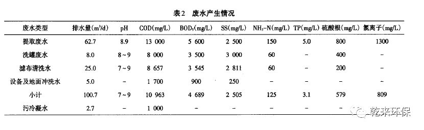 根據(jù)該工程設(shè)計(jì)情況及物料平衡分析,項(xiàng)目提取廢水中主要含有發(fā)酵殘留物、乙酸丁酯及丙酮等溶劑、少量殘留的紅霉素及其他雜質(zhì)等。由于發(fā)酵過程中碳氮比例失調(diào)(氮源過剩),廢水中含有硫酸鹽。此外,根據(jù)物料使用情況,廢水中還會(huì)含有磷酸鹽、氯化鈉等物質(zhì)。目前,紅霉素生產(chǎn)均采用發(fā)酵提取方法,發(fā)酵液經(jīng)過濾后采用溶劑進(jìn)行萃取,然后經(jīng)離心分離、水洗、轉(zhuǎn)堿、干燥等環(huán)節(jié)制取紅霉素,國(guó)內(nèi)紅霉素生產(chǎn)廠家均采用發(fā)酵提取方法進(jìn)行紅霉素生產(chǎn),部分環(huán)節(jié)采用設(shè)備不同,但主體工藝基本一致,因此廢水水質(zhì)差異不大。根據(jù)該紅霉素生產(chǎn)項(xiàng)目的物料平衡計(jì)算,廢水產(chǎn)生情況見表2。