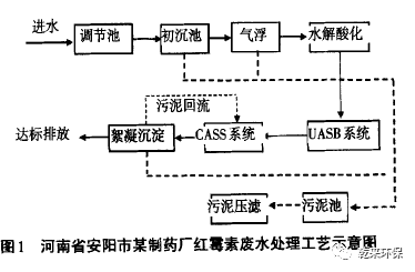 ①紅霉素生產(chǎn)廢水含有較多難生物降解物質(zhì),屬高濃度難生物降解廢水。②目前國(guó)內(nèi)主要的處理工藝路線為預(yù)處理一厭氧一好氧一(后處理)組合工藝。③根據(jù)安陽(yáng)市某制藥廠紅霉素生產(chǎn)廢水水質(zhì)情況,“氣浮+水解酸化+UASB+CASS+絮凝沉淀”組合處理工藝系統(tǒng)能夠處理紅霉素生產(chǎn)廢水,使其達(dá)標(biāo)。