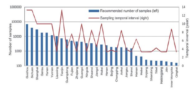 土壤重金屬污染是動(dòng)態(tài)變化的,重金屬濃度隨污染源的輸入和植物吸收、流水等作用輸出的變化而變化。如何在時(shí)間和空間上監(jiān)測(cè)土壤重金屬污染狀況的變化特征亦是一個(gè)不可忽視的重要問題。通過對(duì)前一次樣點(diǎn)的定位,再次采集、分析,比較同一樣點(diǎn)前后兩次土壤重金屬濃度的變化,是最為有效的監(jiān)測(cè)土壤重金屬變化的方式。但因土壤的空間異質(zhì)性、采樣方法和統(tǒng)計(jì)誤差等影響,土壤重金屬濃度變異度的數(shù)值大小可以通過再次采樣而被檢測(cè)是需要考慮的問題。同時(shí),多次大量的樣品采集雖然能夠提高監(jiān)測(cè)精度,但成本也相應(yīng)升高,在操作上不現(xiàn)實(shí)。監(jiān)測(cè)精度和成本的平衡,監(jiān)測(cè)區(qū)域樣品數(shù)量和監(jiān)測(cè)時(shí)間間隔的確定是至關(guān)重要的問題。中國(guó)地質(zhì)大學(xué)Xia等在全國(guó)土壤調(diào)查的基礎(chǔ)上,以主要行政區(qū)域和主要重金屬污染元素為對(duì)象,研究土壤重金屬污染變化監(jiān)測(cè)的樣品采集數(shù)量和采集時(shí)間間隔,發(fā)現(xiàn)由于研究區(qū)域大的空間變異,很難確定土壤重金屬濃度最小可監(jiān)測(cè)的變異;根據(jù)成本、可實(shí)踐性和檢測(cè)的精度,考慮重金屬元素的變異性和設(shè)定變異程度,針對(duì)不同區(qū)域推薦了一系列合適采樣數(shù)量,不同區(qū)域檢測(cè)的時(shí)間間隔為3.3~13.3年(圖1)。該研究為區(qū)域性土壤重金屬污染變化監(jiān)測(cè)提供較好的研究思路和方法。