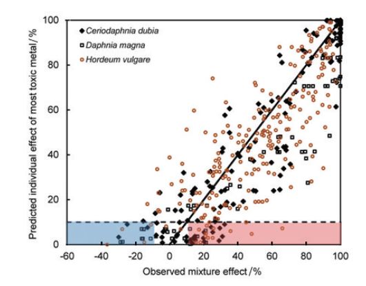 圖2重金屬?gòu)?fù)合污染條件下模型預(yù)測(cè)和觀測(cè)的毒性對(duì)比
