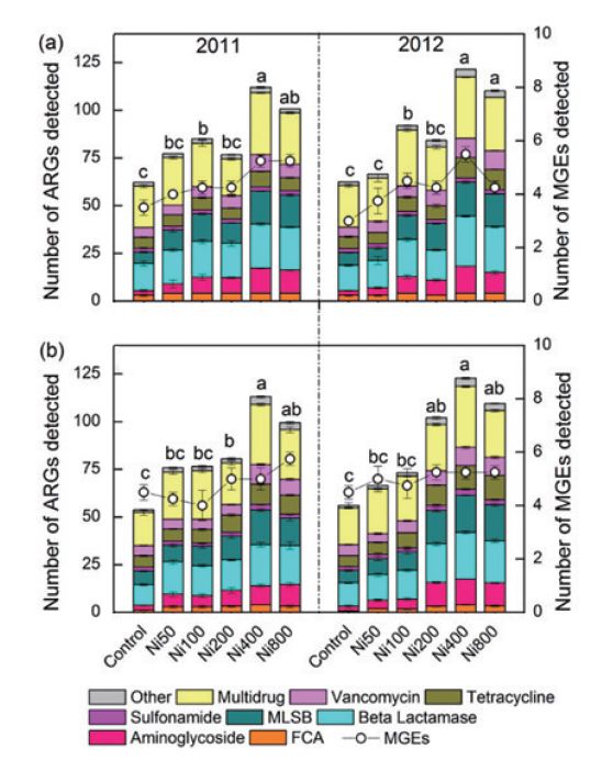抗生素對(duì)細(xì)菌感染、致病微生物感染類疾病的防治具有重要作用,但由此而來的抗性基因的快速增加和傳播也威脅著人體健康??剐曰虻难芯吭桨l(fā)受到學(xué)者關(guān)注,成為研究熱點(diǎn)。除抗生素選擇產(chǎn)生抗性基因外,環(huán)境中重金屬對(duì)抗生素抗性的選擇和傳播擴(kuò)散具有重要作用。中國(guó)科學(xué)院生態(tài)環(huán)境研究中心Hu等通過對(duì)Ni長(zhǎng)期污染土壤誘導(dǎo)的抗性基因進(jìn)行研究,發(fā)現(xiàn)在長(zhǎng)期不同程度Ni污染下,共檢測(cè)到149種抗性基因,以多藥和β-內(nèi)酰胺類抗生素抗性為主,抗性基因的頻率和豐度隨Ni污染程度的增加而升高(圖3);抗性基因與可移動(dòng)抗性原件具有顯著相關(guān)性,表明Ni污染增加了抗性基因的水平轉(zhuǎn)移,該水平轉(zhuǎn)移與intI1整合子有關(guān)。區(qū)別于以往重金屬的直接毒性風(fēng)險(xiǎn),該研究闡述了重金屬在土壤環(huán)境中的間接風(fēng)險(xiǎn)-增加抗性基因產(chǎn)生和傳播風(fēng)險(xiǎn)。