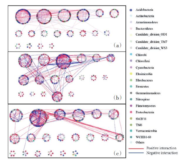 圖9不種植物(a)和種植大豆(b)與玉米(c)對(duì)鎘污染土壤細(xì)菌網(wǎng)絡(luò)關(guān)系的影響