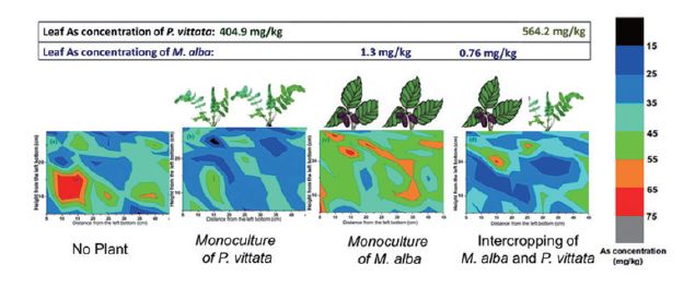 除降低可食作物對(duì)重金屬吸收外,在重金屬污染土壤上種植經(jīng)濟(jì)作物,阻控重金屬在食物鏈中的傳遞風(fēng)險(xiǎn),也是污染農(nóng)田安全利用的措施之一。華中農(nóng)業(yè)大學(xué)Yang等針對(duì)重金屬污染土壤研究重金屬耐性經(jīng)濟(jì)作物3種種植模式(油菜-向日葵、油菜-花生、油菜-芝麻),對(duì)土壤重金屬去除效應(yīng)和農(nóng)作物中重金屬濃度的影響進(jìn)行了研究。結(jié)果表明,油菜-向日葵種植模式去除Cd最高,可達(dá)459g˙ha-1,去除率為1.98%;利用正己烷提取后作物油符合相應(yīng)標(biāo)準(zhǔn),去油后種子殘?jiān)俳?jīng)酒石酸鉀提取后,其重金屬濃度低于飼料標(biāo)準(zhǔn)。經(jīng)濟(jì)作物與超積累植物間作,在安全生產(chǎn)的同時(shí)也能去除土壤污染物,實(shí)現(xiàn)修復(fù)目的。但是在超積累植物和其他植物間作體系下,超積累植物對(duì)重金屬活化和吸收機(jī)制還不清楚,超積累植物是否活化重金屬,增加非超積累植物對(duì)重金屬吸收。中國(guó)科學(xué)院地理科學(xué)與資源研究所Wan等開展了As超積累植物蜈蚣草和桑樹間作的研究,探討了邊生產(chǎn)邊修復(fù)機(jī)制。與單作相比,間作處理?xiàng)l件下蜈蚣草中As濃度顯著增加、桑樹As則顯著降低;對(duì)不同處理下土壤As的空間分布分析發(fā)現(xiàn),不論單作或間作處理蜈蚣草根周圍土壤As濃度較低,沒有活化土壤As(圖10),且在間作處理下桑樹葉中As濃度符合國(guó)家飼料標(biāo)準(zhǔn)。