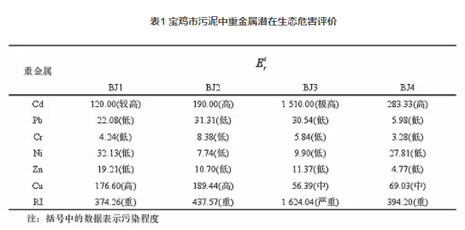 寶雞市污泥中重金屬潛在生態(tài)危害評價見表1。由表1可知,對于潛在生態(tài)危害單項指數(shù)來說,重金屬潛在危害性順序為Cd>Cu>Pb>Ni>Zn>Cr,BJ3中Cd的潛在危害單項指數(shù)達到了1510.00,具有極高生態(tài)風險,4個污泥樣品的Pb、Ni、Zn、Cr的潛在危害單項指數(shù)均小于40,屬于低度生態(tài)風險。BJ3污泥的重金屬綜合潛在生態(tài)危害指數(shù)大于600,為嚴重風險程度,其余3個污泥樣品存在重度生態(tài)風險。污泥重金屬的綜合潛在生態(tài)危害性(RI)順序為BJ3>BJ2>BJ4> BJ1。綜上可知,污泥中Cd和Cu是主要的潛在生態(tài)風險元素,在土地利用特別是農用過程中存在一定的生態(tài)風險。