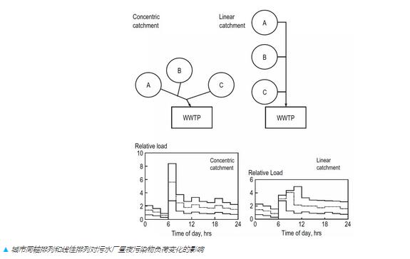Gujer教授提醒我們污水處理系統(tǒng)除了污水處理廠之外,管網(wǎng)也是其重要的組成。污水廠的進(jìn)水負(fù)荷變化在某程度是由于污染物進(jìn)入管網(wǎng)時(shí)間的差異,以及管網(wǎng)分布的長度造成的,這兩個(gè)因素都跟時(shí)間這個(gè)變量有關(guān)。Gujer教授用下圖闡述了同軸排列和線性排列兩種排放模式的區(qū)別——前者的負(fù)荷變化更大,而后者的收集方式能使進(jìn)水水質(zhì)更穩(wěn)定。由于晝夜負(fù)荷變化很大程度上控制了生物處理過程中的硝化性能,所以使用后者的城市規(guī)劃模式對該地區(qū)的污水處理是有好處的。