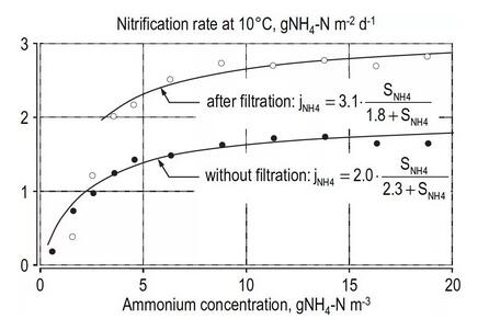 但是Gujer教授也承認(rèn),雖然這個(gè)模型一方面對開發(fā)新工藝技術(shù)很有幫助,但是他們當(dāng)時(shí)也意識(shí)到模型的局限性——在縮減的空間和時(shí)間里,它并不能將實(shí)際工程應(yīng)用的方方面面都成功模擬。例如下圖,中試實(shí)驗(yàn)顯示經(jīng)過無硝化高效生物處理后的生物濾池三級(jí)處理的硝化情況顯示過濾截留了二級(jí)處理出水中的懸浮固體,但是在實(shí)際應(yīng)用中卻不是這樣。