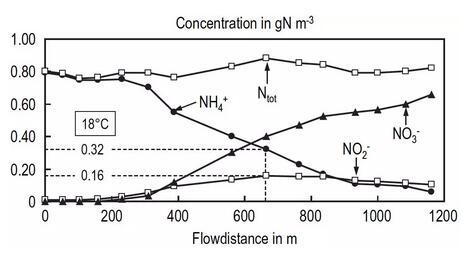 Gujer教授強(qiáng)調(diào),僅僅能夠預(yù)測污水的硝化表現(xiàn)是不夠的,更重要的是要弄清出水中氮的最終去向。下圖展示的是某富營養(yǎng)化湖泊的厭氧出水排入一條小溪后,其中的氮轉(zhuǎn)化達(dá)到接近靜態(tài)的所需距離。我們需要充足的空間才能發(fā)現(xiàn)自然凈化的數(shù)據(jù)。