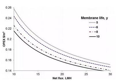 通過(guò)對(duì)主要參數(shù)的計(jì)算對(duì)比可以發(fā)現(xiàn),膜通量是OPEX中影響力最高的因子,因?yàn)樗瑫r(shí)影響了單位能耗和膜更換的成本。
