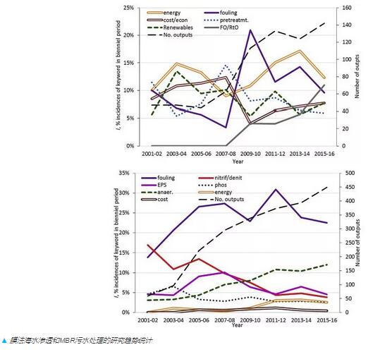 盡管能耗不是MBR研究的最主要焦點(diǎn),通量卻成為其關(guān)于單位能耗的研究重點(diǎn),而厭氧MBR的研究也穩(wěn)定增長(zhǎng);