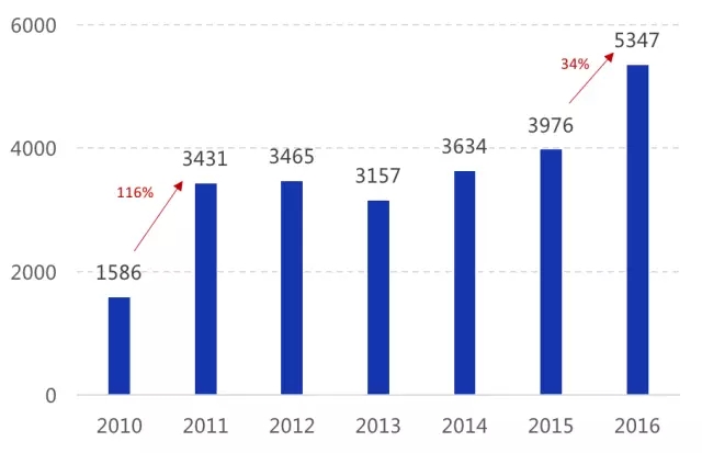 資質(zhì)企業(yè)平均規(guī)模較小:2016年我國持危險廢棄物經(jīng)營許可證的企業(yè)數(shù)量為2149家,2016年凈增加僅115家,體現(xiàn)出環(huán)保系統(tǒng)對新頒發(fā)許可證愈發(fā)謹(jǐn)慎;平均每家處理量僅不到3萬噸,呈現(xiàn)較強(qiáng)的分散性特征,但單企業(yè)處理規(guī)模由2014年2.2萬噸/年增加到2016年3.0萬噸/年,未來隨著許可證頒發(fā)與復(fù)核難度加大,實力弱、技術(shù)差的小企業(yè)將被淘汰出市場,龍頭擴(kuò)張,單企業(yè)規(guī)模繼續(xù)擴(kuò)大。