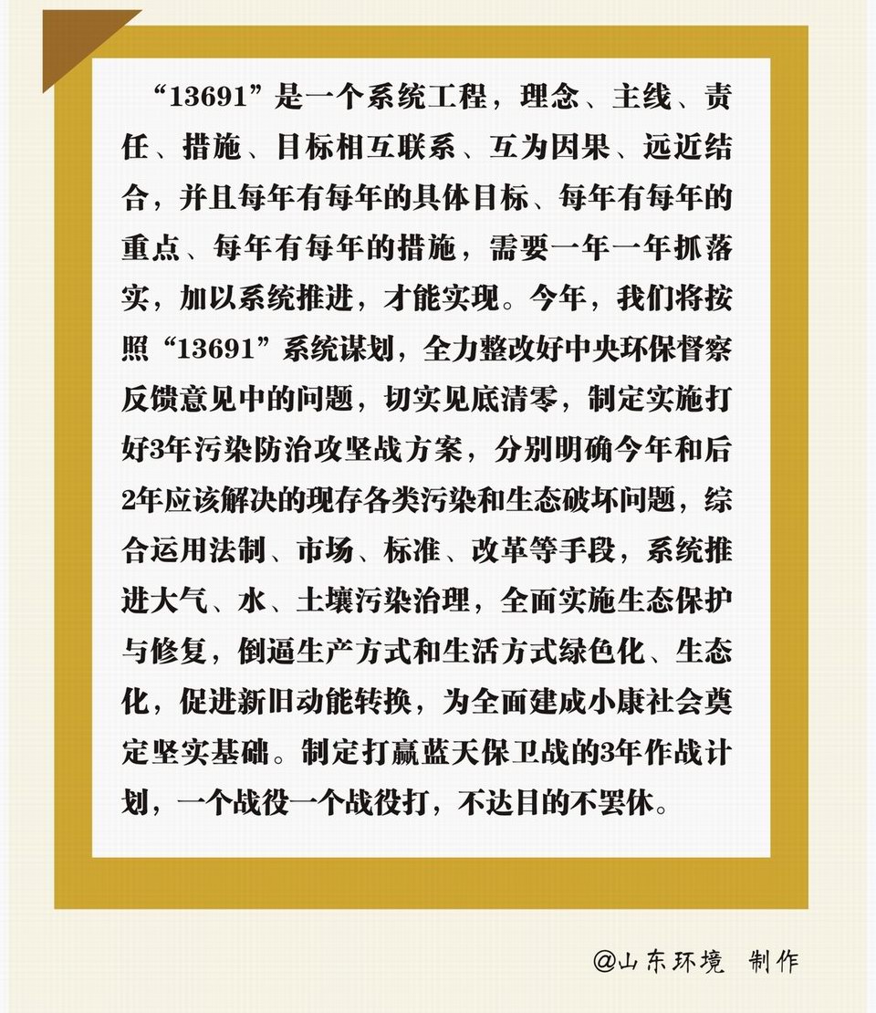 前言:2018年,山東省將按照“13691”系統(tǒng)謀劃,全力改好中央環(huán)保督察反饋意見中的問題,切實見底清零,制定實施打好3年污染防治攻堅站方案,分別明確今年和后2年應(yīng)該解決的現(xiàn)存各類污染和生態(tài)破壞問題,綜合運用法治、市場、標準、改革等手段,系統(tǒng)推進大氣、水、土壤污染治理,全面實施生態(tài)保護和修復,倒逼生產(chǎn)方式和生活方式綠色化、生態(tài)化,促進新舊功能動能轉(zhuǎn)換,為全面建成小康社會奠定堅實基礎(chǔ)。制定打贏藍天保衛(wèi)戰(zhàn)的3年作戰(zhàn)計劃,一個戰(zhàn)役一個戰(zhàn)役打,不達目的不罷休。