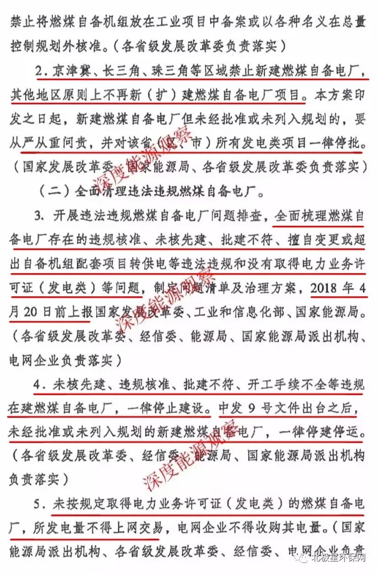 全面梳理燃煤自備電廠的違規(guī)準(zhǔn)備、批建不符等各類(lèi)問(wèn)題,4月20號(hào)前上報(bào)發(fā)改委、工信部、能源局。對(duì)于違規(guī)在建的燃煤燃煤自備電廠,一律停建!中發(fā)9號(hào)文之后,未經(jīng)批準(zhǔn)或未未列入規(guī)劃的新建燃煤自備電廠,一律停建、停運(yùn)!