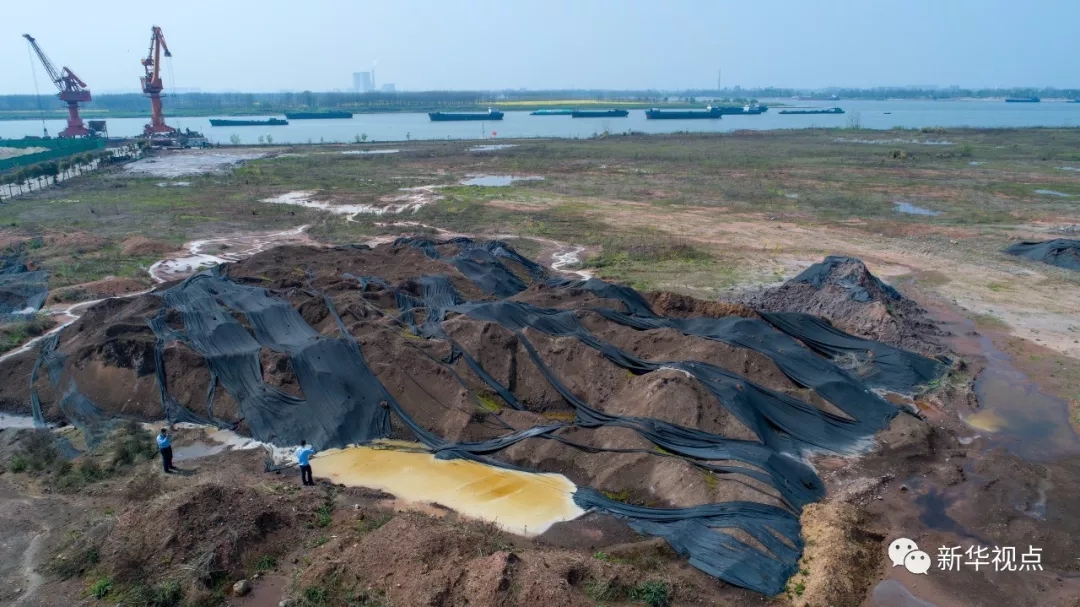 這是3月29日用無(wú)人機(jī)拍攝的安徽貴池前江工業(yè)園內(nèi)池州恒鑫材料科技有限公司廠區(qū)內(nèi)的長(zhǎng)江堤岸旁傾倒的選礦尾渣。新華社記者 郭晨 攝