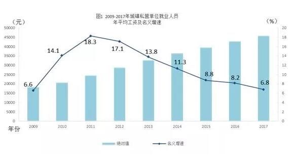 2018年5月15日,國(guó)家統(tǒng)計(jì)局發(fā)布了2017年平均工資主要數(shù)據(jù)。2017年全國(guó)城鎮(zhèn)私營(yíng)單位就業(yè)人員年平均工資為45761元,與2016年的42833元相比,增加了2928元,同比名義增長(zhǎng)6.8%,增速比2016年回落1.4個(gè)百分點(diǎn)??鄢飪r(jià)因素,2017年全國(guó)城鎮(zhèn)私營(yíng)單位就業(yè)人員年平均工資實(shí)際增長(zhǎng)5.0%。