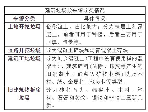 建筑垃圾的產(chǎn)生主要是在建筑施工、裝飾裝修階段與舊建筑的改建中產(chǎn)生的,主要分為土地開(kāi)挖垃圾、道路開(kāi)挖垃圾、建筑工地垃圾和舊建筑物拆除垃圾四大類,具體分類如下: