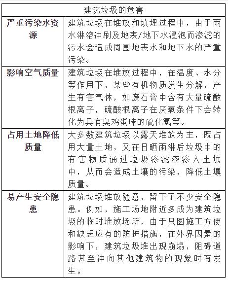 我國(guó)絕大部分建筑垃圾未經(jīng)任何處理便被運(yùn)往郊外露天堆放或填埋,既占用大量土地,又容易在清運(yùn)和堆放過(guò)程中的遺撒粉塵、灰砂飛揚(yáng)等問(wèn)題,進(jìn)而造成嚴(yán)重的環(huán)境污染。