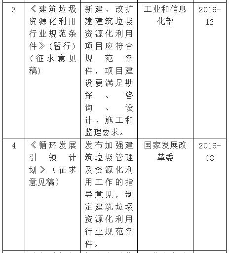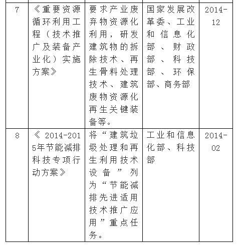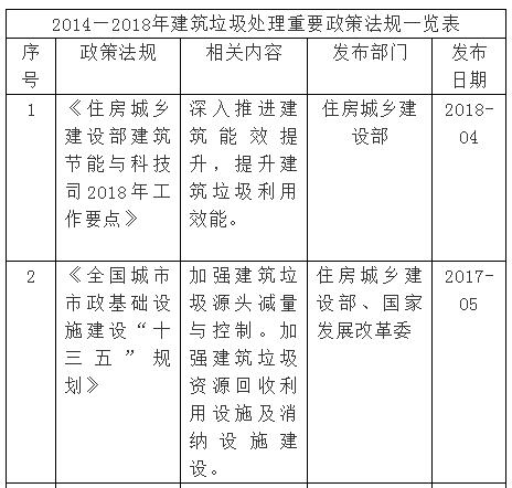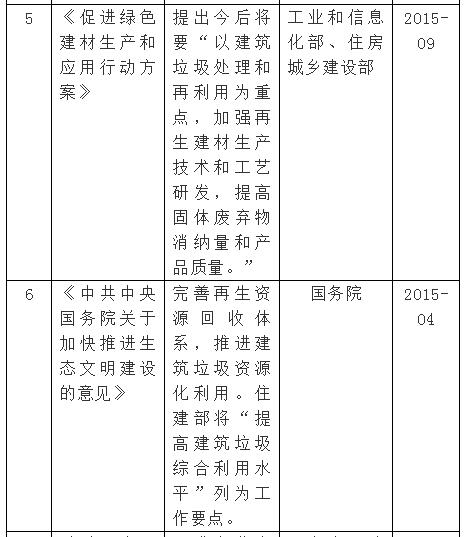 長(zhǎng)期以來(lái),由于缺乏統(tǒng)一完善的建筑垃圾管理辦法和良好的產(chǎn)業(yè)扶持政策致使建筑垃圾絕大部分未經(jīng)任何處理便被露天堆放或簡(jiǎn)易填埋,如何處理和利用建筑垃圾,已經(jīng)成為政府所面臨的一個(gè)重要難題。為了解決建筑垃圾處理難題,促進(jìn)建筑垃圾循環(huán)利用,國(guó)家近幾年頒布了一系列的政策法規(guī),具體政策如下:
