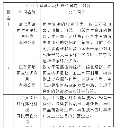 根據(jù)《中國(guó)報(bào)告大廳網(wǎng)》匯總信息得知,截至2017年底,通過(guò)對(duì)建筑垃圾處理行業(yè)各項(xiàng)數(shù)據(jù)統(tǒng)計(jì),建筑垃圾處理公司排名前十的分別是清遠(yuǎn)華清、江蘇黃埔、元泰達(dá)、天實(shí)偉創(chuàng)、上海山美、德濱環(huán)保、鼎盛工程、凱興礦山、一帆機(jī)械、黎明重工,詳細(xì)情況介紹如下: