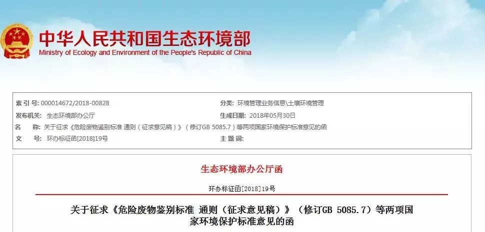 關(guān)于征求《危險(xiǎn)廢物鑒別標(biāo)準(zhǔn) 通則(征求意見(jiàn)稿)》(修訂GB5085.7)等兩項(xiàng)國(guó)家環(huán)境保護(hù)標(biāo)準(zhǔn)意見(jiàn)的函