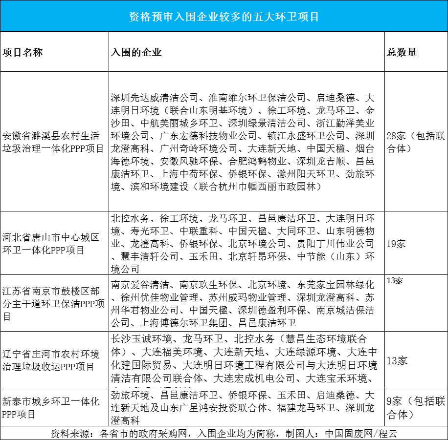 殊不知開年以來,不少環(huán)衛(wèi)項(xiàng)目資格預(yù)審入圍企業(yè)均超過13家(如下圖),5月11日中國政府采購網(wǎng)公布的安徽淮北市濉溪縣農(nóng)村垃圾治理項(xiàng)目,入圍企業(yè)高達(dá)26家,其中2家為聯(lián)合體投標(biāo)。不少業(yè)內(nèi)人士表示如此強(qiáng)大的競爭陣容實(shí)屬罕見,可見競爭激烈程度已達(dá)到白熱化,一年勝似一年。