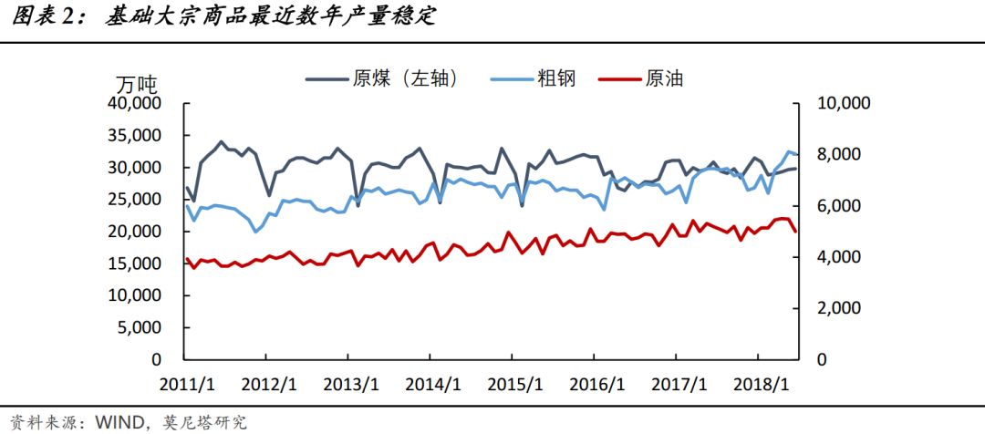 從2012-2017年數(shù)據(jù)來看,三類主要工業(yè)基礎(chǔ)品保持在一個溫和穩(wěn)定的增長范圍。特殊的是,原煤的產(chǎn)量還出現(xiàn)了微幅負(fù)增長,其中有我國能源利用結(jié)構(gòu)轉(zhuǎn)型的因素,但還需要考慮到原煤洗選率的提高(從60%左右提升至70%),燃煤效率得到大幅提升(洗選后燃煤熱效率提升10-15%)。