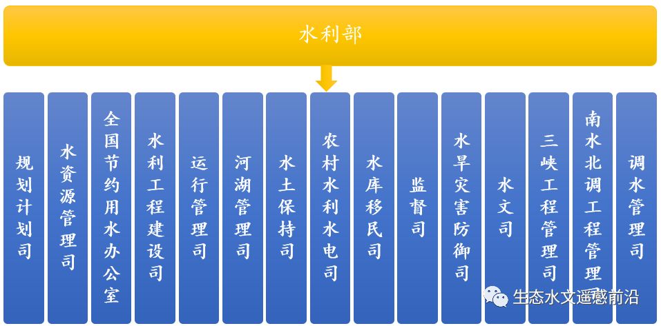 水利部下設(shè)規(guī)劃計(jì)劃司、水資源管理司、全國節(jié)約用水辦公室、水利工程建設(shè)司、運(yùn)行管理司、河湖管理司、水土保持司、農(nóng)村水利水電司、水庫移民司、監(jiān)督司、水旱災(zāi)害防御司、水文司、三峽工程管理司、南水北調(diào)工程管理司、調(diào)水管理司等機(jī)構(gòu)。
