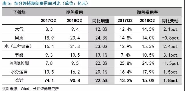 2018Q2環(huán)保板塊期間費(fèi)用累計(jì)支出約90.8億元,同比增22.5%;其中,大氣(9.4億元,同比增12.8%)、固廢(23.4億元,同比增24.3%)、水(工程設(shè)備)(21.8億元,同比增33%)、節(jié)能(10.5億元,同比增13.1%)、監(jiān)測(cè)&檢測(cè)(9.5億元,同比增22.3%)及水務(wù)運(yùn)營(yíng)板塊(16.2億元,同比增20.1%);期間費(fèi)用率提升1.8pct至15%。其中銷售費(fèi)用率2.6%,同比增0.2pct;管理費(fèi)用率8.5%,同比增0.5pct;財(cái)務(wù)費(fèi)用率3.9%,同比增0.8pct。財(cái)務(wù)費(fèi)用率繼續(xù)呈現(xiàn)單季度上升趨勢(shì),與當(dāng)下融資成本大幅度上升有關(guān)。