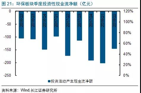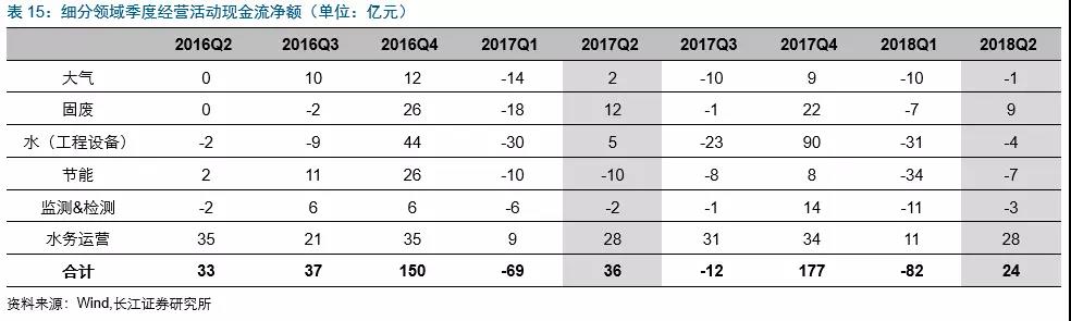 2018Q2大氣板塊因龍凈環(huán)保購(gòu)買華泰保險(xiǎn)4.9%股權(quán)支付17.6億(Q2支付14個(gè)多億)的影響投資活動(dòng)現(xiàn)金流凈額略有下滑(絕對(duì)值變大),固廢&水(工程設(shè)備)等偏PPP類板塊投資活動(dòng)現(xiàn)金流凈額均有所收縮(絕對(duì)值減小)。