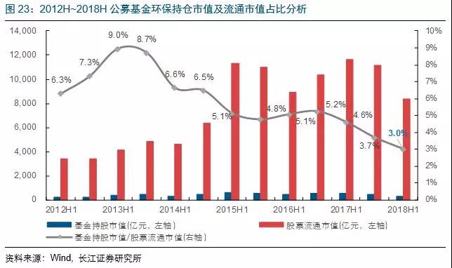 2018H1基金持股總市值約為252億元,占公司流通市值3.0%,處于歷史底部,持倉(cāng)占基金規(guī)模1.2%,同比降1pct;募基金配置較多的股票有東方園林(24.8億元)、碧水源(24.2億元)、華測(cè)檢測(cè)(19.5億元)、東江環(huán)保(15.4億元)、聚光科技(14.2億元)、格林美(11.2億元)、三聚環(huán)保(10.4億元)等公司。