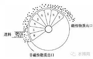 含有磁粉和污泥的污水從轉(zhuǎn)鼓的一端進(jìn)入分離裝置,固定磁極將磁性顆粒吸出并附著在滾筒表面,隨著滾筒的轉(zhuǎn)動,被帶至磁系邊緣的低磁區(qū),并從磁性物質(zhì)出口卸下,非磁性物質(zhì)則在重力的作用下,沿分離槽流至非磁性物質(zhì)出口排出,完成磁性物質(zhì)和非磁性物質(zhì)的分離過程。