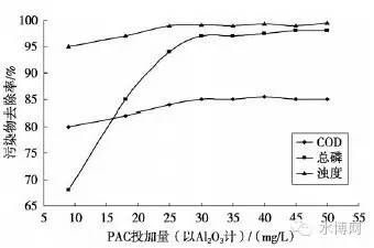 保持其他參數(shù)不變,將PAM投加質(zhì)量濃度恒定,調(diào)節(jié)PAC的投加量(以Al2O3計),分別測試各種加藥量下的COD、總磷及濁度指標(biāo),并計算出各項污染物的去除率,將試驗結(jié)果繪于圖3中。