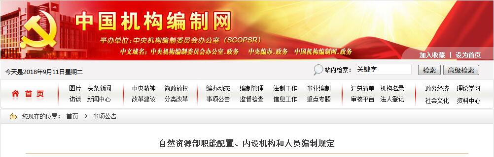 9月11日,中國(guó)機(jī)構(gòu)編制網(wǎng)發(fā)布了自然資源部三定方案。詳情如下: